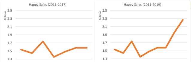 Before 2017 Happy sales had been flatlining. After 2017 they rose by 25% a year, up to the pandemic.