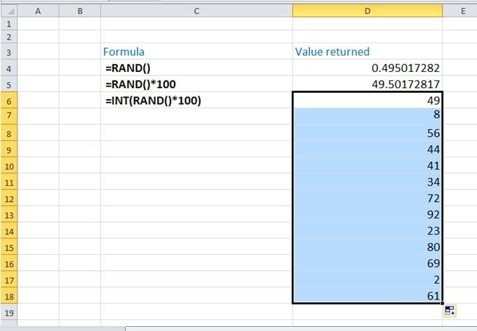 The RAND (Random) function returns a value between 0 and 1. We then multiply this by 100 to get a value between 0 and 100, we also nests-in the INT function (Integer) in order to drop off the decimal places.