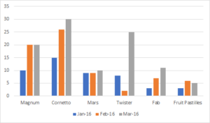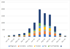 For example, in this chart, you can see the total number of sales of each brand of ice cream. It’s very easy to see at a glance that Magnum’s have been overall the most popular, followed by the Cornetto.