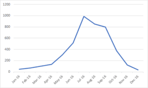 Data on the X Axis is labelled chronologically, so on our example December 2015 and January 2017 are shown even though they are not included in our data set.