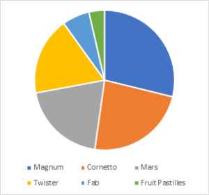 These charts can be customised to show in 3D, as well as to show different information in the legends – with the exact figure on each slice of the pie. In our example, this might be helpful when comparing the Cornetto, Mars and Twister sales to see which is most popular – as each slice is very similar in size.