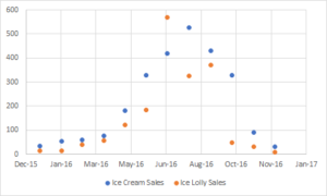 Finally, the Scatter Graph is similar to the Line Chart – it shows how two series of data compare over time. It is designed to identify a relationship and correlation between two data sets. In our example, we’ve shown ice cream sales vs ice lolly sales, to show if one type of product is more popular at certain times of the year.