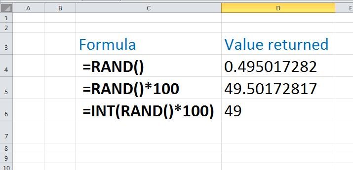 The RAND (Random) function returns a value between 0 and 1. We then multiply this by 100 to get a value between 0 and 100, we also nests-in the INT function (Integer) in order to drop off the decimal places.