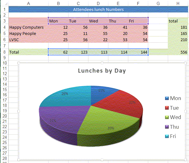If we consider the table of data below that we have three rows of data organised into five columns. This data will not make a good pie chart!